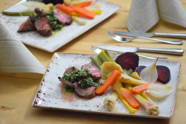 Gemüse auf dem Teller platzieren, Lammkrone aufschneiden und mit Petersilienpesto beträufeln.