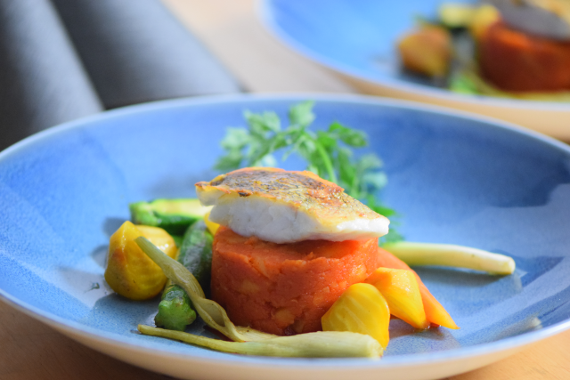 Gekochte und zerstampfte Kartoffeln erhalten ihre rote Farbe durch das beigemischte Paprikapulver, das ihnen einen Hauch ungarisches Flair verleiht, dazu kommt ein Zander mit Knusperhaut. Rübchen, Karotten mit Grün, Minifenchel und Jungzwiebel sorgen dafür, dass bei diesem Fischgericht das gesunde Gemüse nicht zu kurz kommt.