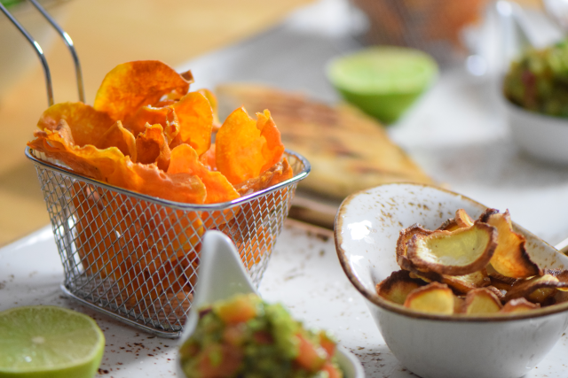 Für die Chips Süßkartoffel und Petersilwurzel mit der Mandoline in Scheiben hobeln und vofrittieren.
