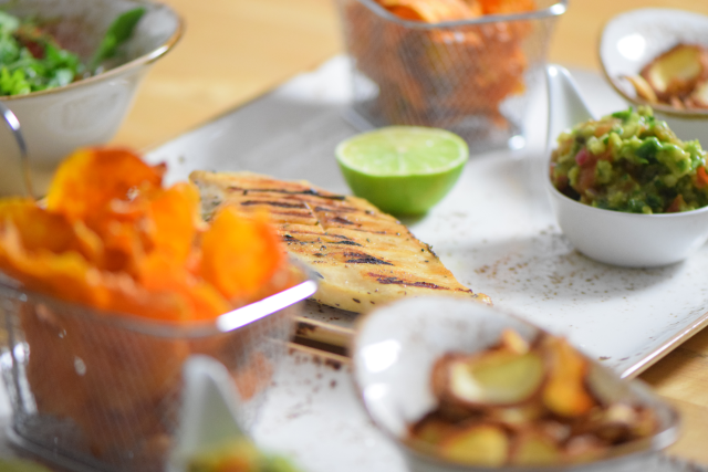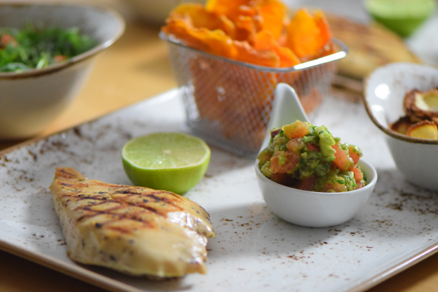 Noch ein Rezept, bei dem wir uns haben aushelfen lassen, so wie hier. Die Hühnerbrust war schon fertig sous vide gegart. Wir haben sie nur noch grillen müssen und Guacamole und Chips dazu gemacht. Dazu kommt noch ein Rucolasalat.