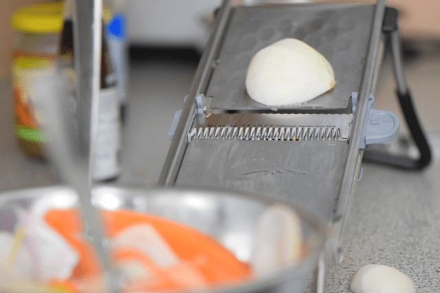 Für den Salat weißen Rettich, Karotten mit der Mandoline in feine Scheiben hobeln. Jungzwiebel und Chili in dünne Ringe schneiden.