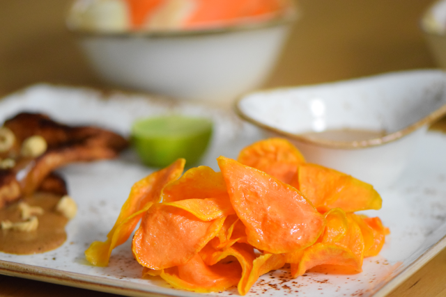 Für die Süßkartoffelchips die Süßkartoffeln in dünne Scheiben hobeln und frittieren.