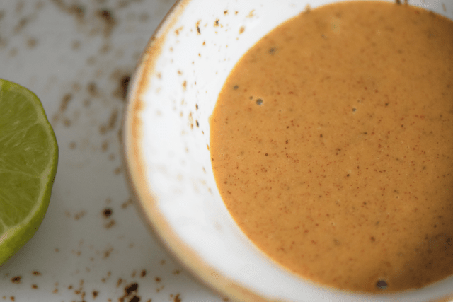 Für den Haselnussdip 3 EL Haselnuss-Mus, 2 TL Sojasauce, 1 TL Fischsauce, 1 TL Ahornsirup, 2 TL Limettensaft zusammenrühren. Mit Wasser glatt streichen.