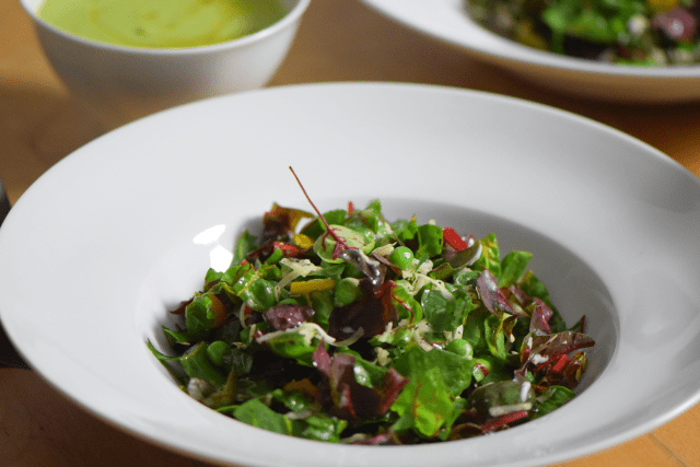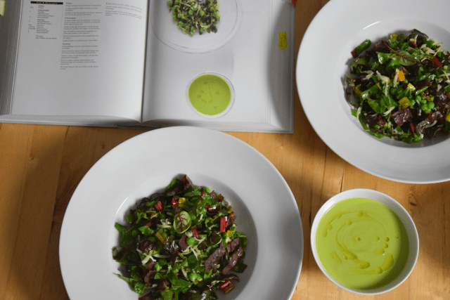Die Suppe hat, auch wenn sie kalt ist, den vollen Geschmack nach Erbsen. Dazu kommt ein Salat aus Mangold, Bergkäse und Bergbohnenkraut als Suppeneinlage.