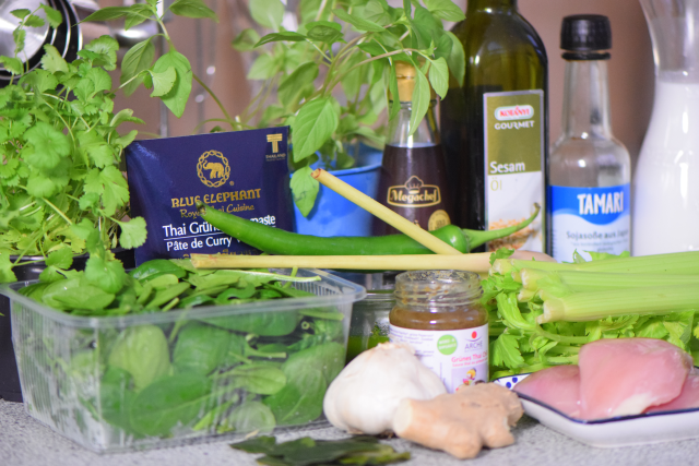 Das Originalrezept gibt es bei der grandiosen Tanja Grandits in ihrem Buch „kräuter“ auf Seite 207 zu finden: „Maispoularden Limettencurry mit Sellerie und Thaibasilikumöl“