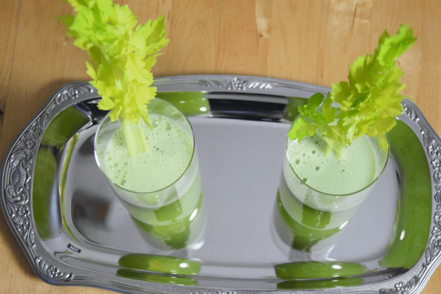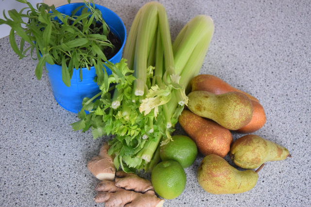 Zwei Stangensellerie (= zirka 20 Stangenselleriestangen), 8 Birnen, 100 g Ingwer mit dem Entsafter auspressen.