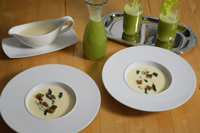 Selleriesuppe mit Schaf-Roquefort und frittierten Salbeiblättern, eine warme Wintersuppe. Doch bevor einem zu warm wird, gibt es ein kühlendes Getränk dazu: Selleriebirnensaft mit Ingwer und Estragon eiskalt serviert.