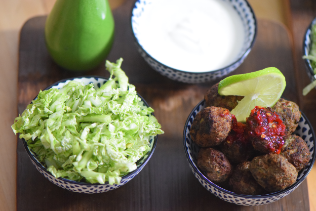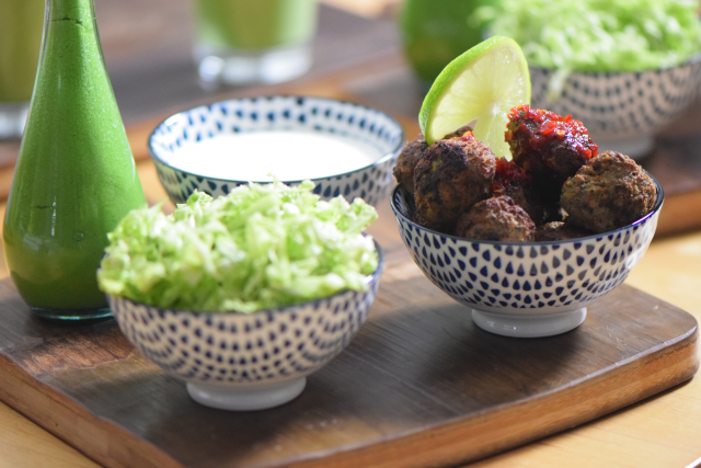 Scharf gewürzte Fleischbällchen mit Chinakohl in einem Miso-Koriander-Dressing und Avocado Smoothie.