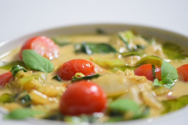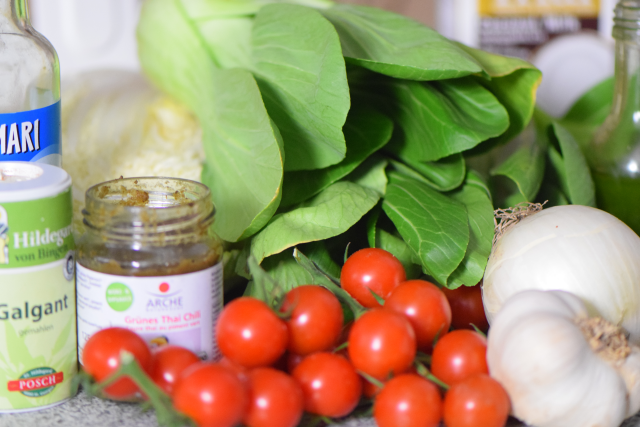 Weiße Zwiebel schneiden, Knoblauch hacken, in Olivenöl mit gemahlenem Galgant und grüner Chilipaste anschwitzen. Pak Choi schneiden und dazu geben. Mit Kokosmilch aufgießen und köcheln lassen. Mit Sojasauce und Galgant abschmecken. Kirschtomaten dazu geben.