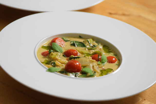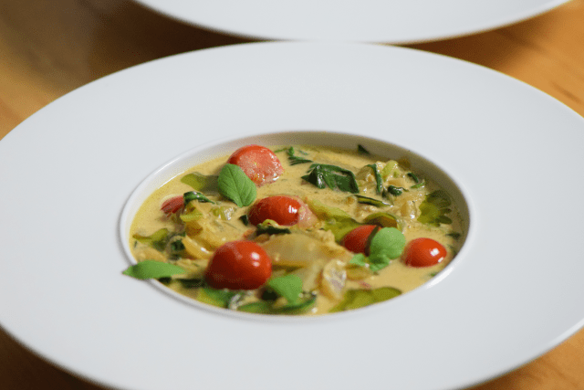 Weiße Zwiebel schneiden, Knoblauch hacken, in Olivenöl mit gemahlenem Galgant und grüner Chilipaste anschwitzen. Pak Choi schneiden und dazu geben. Mit Kokosmilch aufgießen und köcheln lassen. Mit Sojasauce und Galgant abschmecken. Kirschtomaten dazu geben.