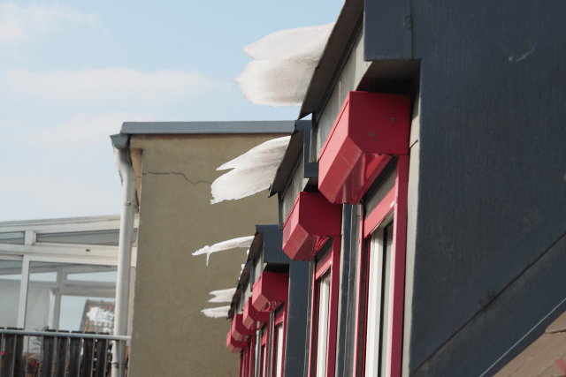 Wenn diese Eisschollen herunterkommen, schlagen sie auf der Außenfensterbank auf, wo sie zerbersten.