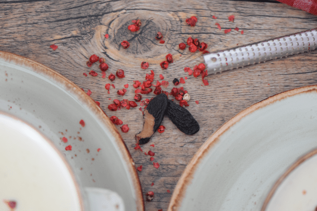 Die Tonkabohne verleiht der Suppe eine erdige, bittere Grundnote. Die Rosa Beeren sind nicht scharf, wenn man sie zerbeißt. Diese aromatischen Farbkleckse lösen einen kurzen Schauer auf der Zunge aus, der momentan für süß-bittere Abwechslung sorgt. Beim Anrichten sparsam damit umgehen, damit das Aromenspiel mit dem feinen Spargel nicht aus dem Gleichgewicht gerät.