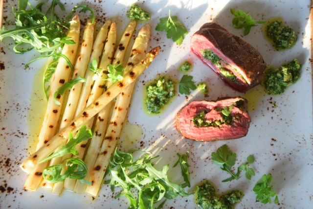 Das Flanksteak wird mit einem Pesto gefüllt und zusammengebunden. Dazu gibt es Rucola und gegrillten Spargel. Hier kommt der Spargel aus dem vorigen Gericht zur Anwendung.