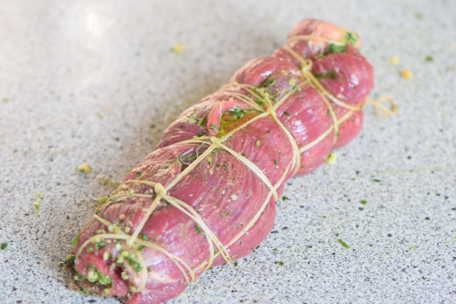 Das Flanksteak plattieren, das Fleisch salzen und pfeffern, mit Pesto einstreichen, aufrollen. Etwas Pesto zum Anrichten später auf die Seite legen.