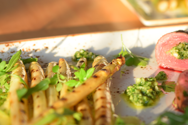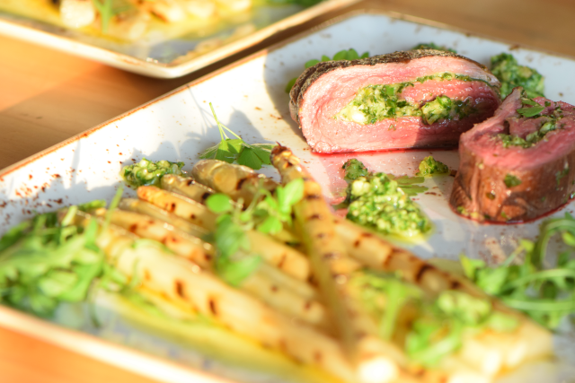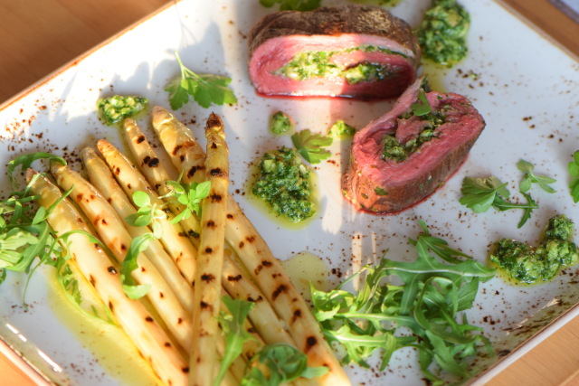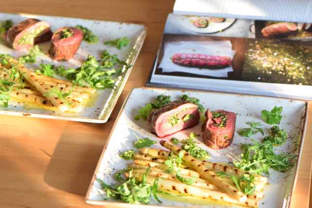 Das Flanksteak wird mit einem Pesto gefüllt und zusammengebunden. Dazu gibt es Rucola und gegrillten Spargel. Hier kommt der Spargel aus dem vorigen Gericht zur Anwendung.