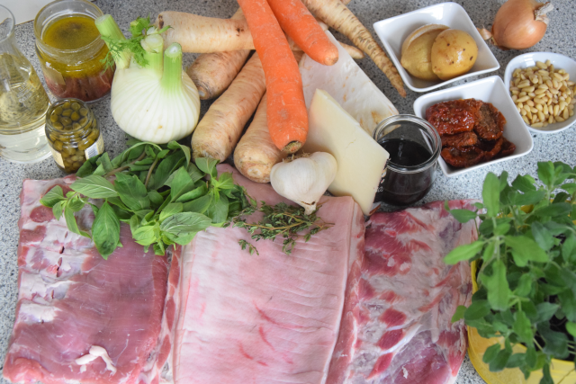 Manuela Rüther: Backe Brust und Bauch, AT Verlag 2018, „Krosser Rollbraten mit Zitrone, Kapern und Oliven“, S. 234 nachempfunden.