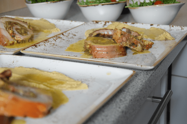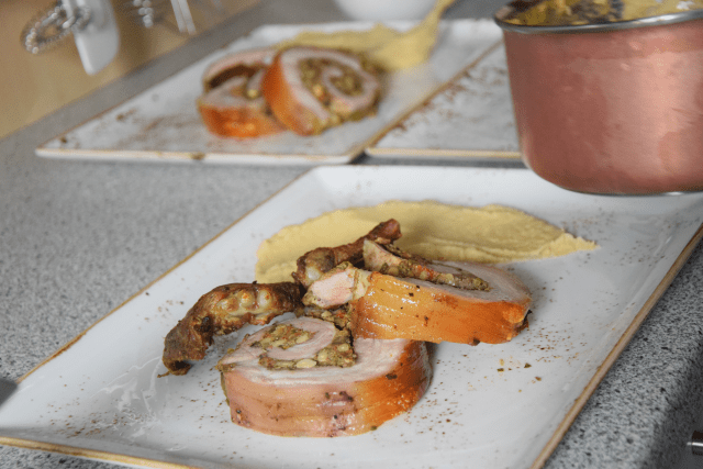 Dieser Rollbraten ist außen knusprig und innen saftig. Vom Schweinebauch, dadurch saftig. Durchs Grillen knusprige Kruste. Dazu kommt ein Petersilienwurzelpüree und Rucolasalat.