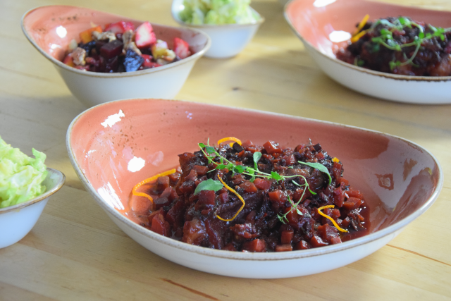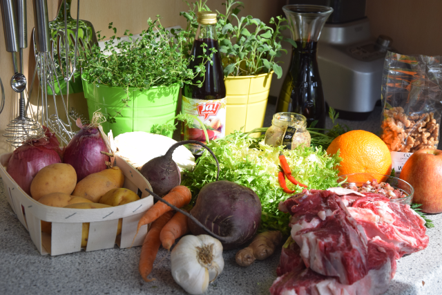 mit Roter Bete, Ingwer, Chili und Orange. Das Fleisch vom Rinderhals wird kurz gebraten und 2 Stunden lang geschmort mit viel Gemüse. Dazu gibt es Kartoffel-Endivien-Stampf und Rote-Bete-Salat.