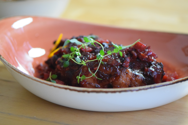 Manuela Rüther: Backe Brust und Bauch, 2018, „Geschmortes Rinderhalsstücke mit Roter Bete, Ingwer, Chili und Orange“, S. 30 nachempfunden.