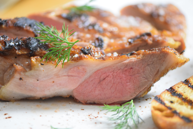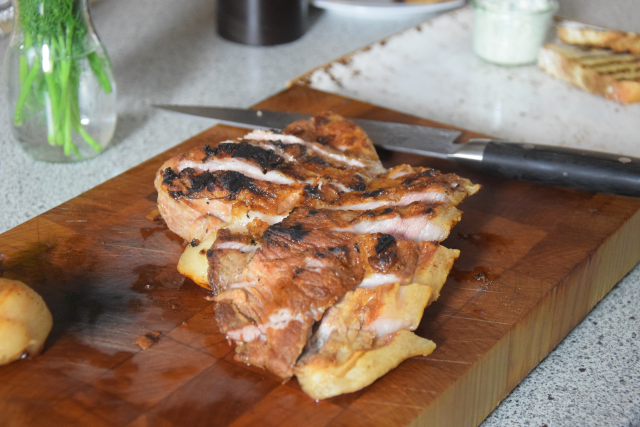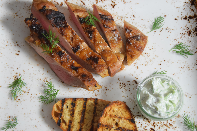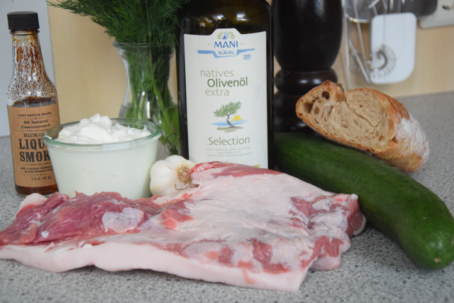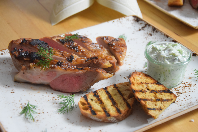 Geräuchertes und gegrilltes Secreto mit Gurken-Knoblauch-Joghurt. Dazu gegrilltes Brot und ein Westvleteren, das berühmte Bier der belgischen Trappisten; zusammen mit dem geräucherten Secreto eine Geschmacksvollendung.