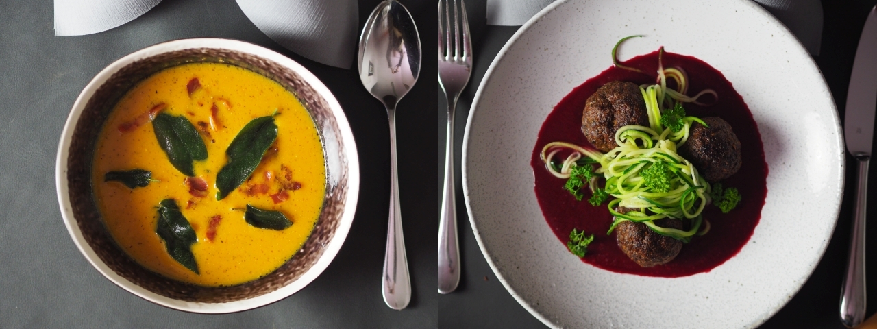 Das ist unser Menü für Schonkost, schonend für den Magen, und wenn man dem Buch glauben mag, an dem wir uns orientierten, dann ist es sogar heilend! Denn nichts weniger als heilende Brühe für den Darm wird für die Butternuss-Salbei-Suppe verwendet, selbstredend ist Salbei eine Heilpflanze. Für die Sauce bei den Faschierten Laberln kommt eine Tomatensauce zum Einsatz, aber ohne Tomaten bitte sehr, und selbstverständlich sind die Nudeln purer Zucchino, also keine Kohlenhydrate weit und breit, die den Magen belasten. Das ist Schonkost, die schmeckt. Schonend für den Magen, schmeichelnd für den Gaumen.