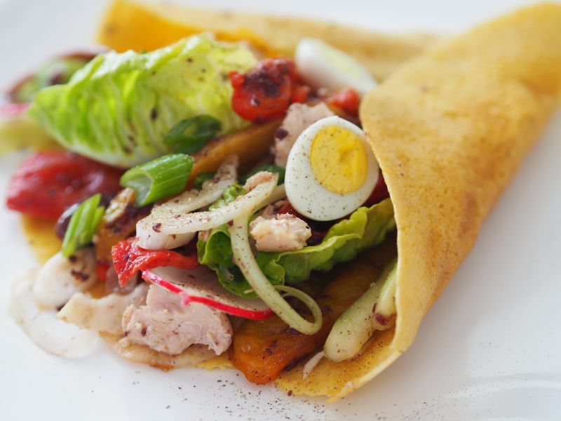 Socca Für den Kichererbsenteig das Kichererbsenmehl, Salz und Olivenöl in einer Schüssel vermischen und nach und nach mit Wasser verrühren. Dann im Kühlschrank ruhen lassen. Nizzasalat die Wachteleier hart kochen und halbieren. Fenchel und Radieschen in dünne Scheiben schneiden, Salatgurke und Stangensellerie in Stifte schneiden, alles in eiskaltes Wasser legen. Die frischen Tomaten blanchieren, die Haut abziehen und die Kerne entfernen und das Fruchtfleisch in Streifen schneiden. Basilikumblätter grob hacken. Paprika grillen, Haut abziehen und in Streifen. Thunfischfleisch in grobe Stücke schneiden. Von den Salatherzen die Blätter schneiden. Eine Salatschüssel mit Knoblauch ausreiben und alle Zutaten, sowie schwarzen Oliven, Anchovis und in Scheiben geschnittenen Jungzwiebeln hineingeben. Ein Dressing aus Tapenade, Olivenöl, Salz und frisch gemahlenem Pfeffer machen und unter den Salat heben. Soccas In einer Palatschinkenpfanne einen Faden Olivenöl erhitzen und in die geschwenkte Pfanne den Teig gießen, mit einem Palatschinken-Schuber gleichmäßig verteilen. Auf einer Seite zwei Minuten braten, umdrehen und ein paar Sekunden auf der andere Seite braten. Anrichten Das Gemüse auf der Socca verteilen und einschlagen.