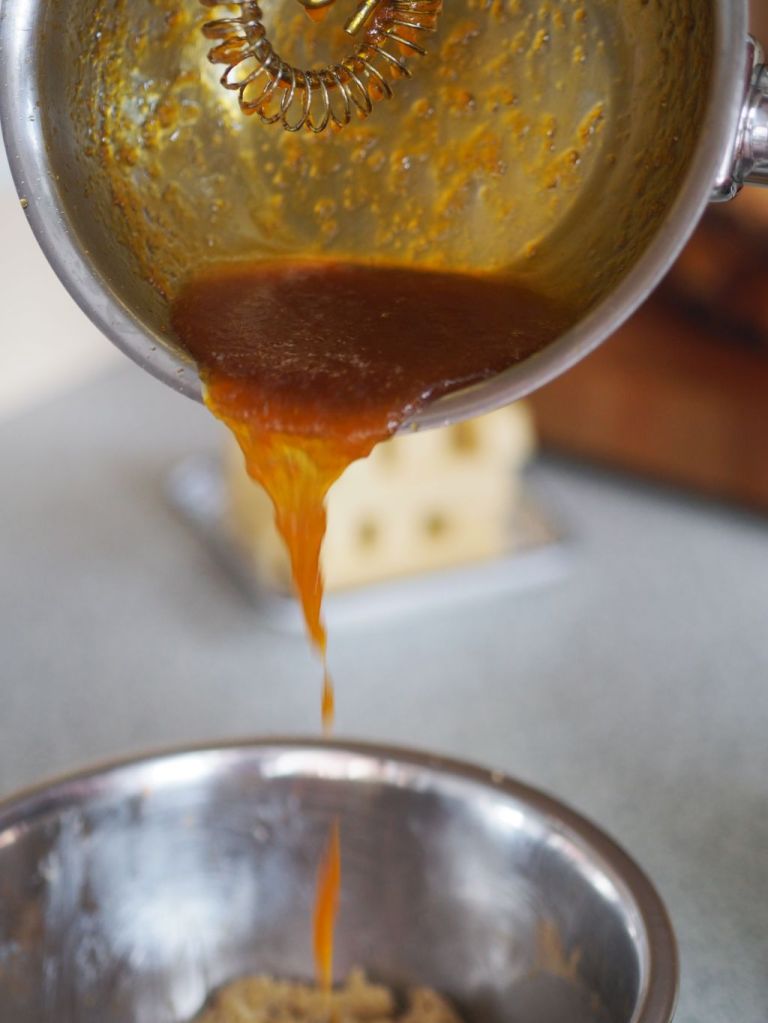 Zitruskruste den Zester und den Saft von einer Grapefruit, von 3 Orangen und 2 Zitronen mit 30 g Zucker in einer Sauteuse zu einem Sirup reduzieren. Dann 100 g Butter, 60 g Brösel und 1 EL körnigen Senf vermischen, den Zitrussirup einarbeiten und reduzieren. Bis zum Verwenden kühl stellen. Socca und Panisses vorbereiten.