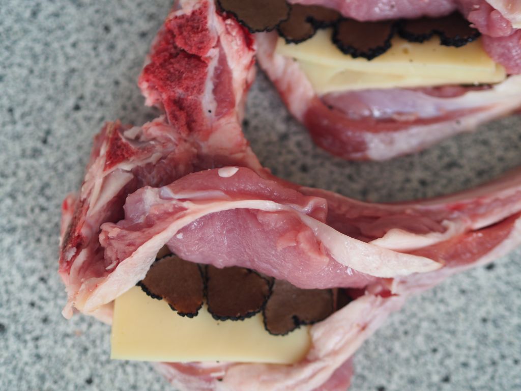 In das Kalbskotelett eine Tasche schneiden, eine Scheibe Fontina-Käse hineinlegen, darauf drei Scheiben Trüffel, mit Zahnstocher verschließen, salzen, pfeffern und panieren: mehlieren, durch gesalzene, verschlagene Eier ziehen und in Brösel wenden. Dann in Butterschmalz in der Pfanne herausbacken.