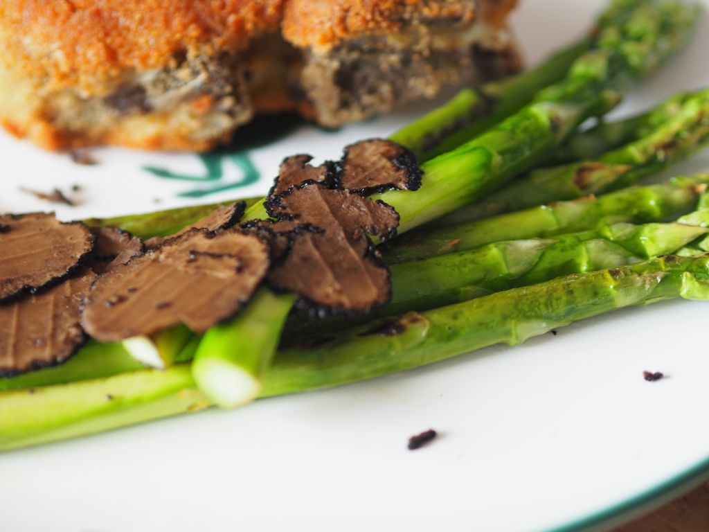 Den grünen Spargel in der Bratpfanne mit wenig Butter braten. Anrichten: Trüffelscheiben darüber hobeln.