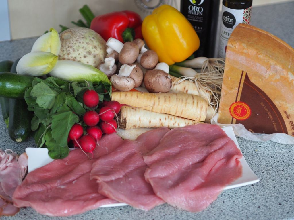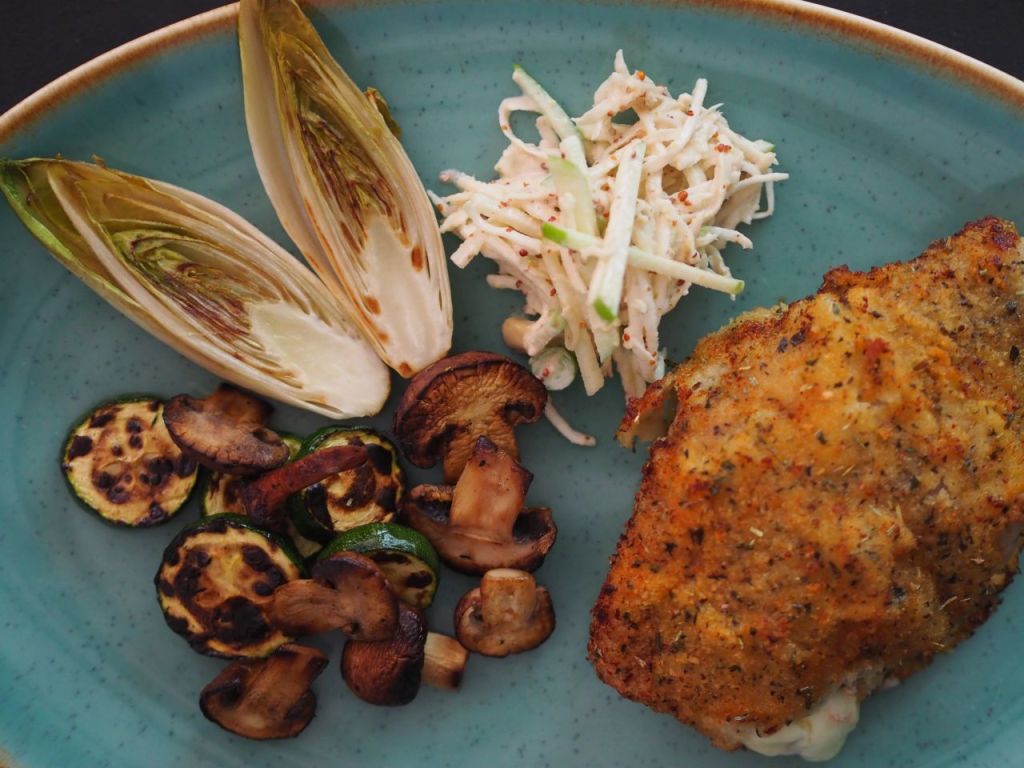 2. Cordon Bleu mit Sellerie-Mayonnaise-Salat, gebratenen Champignons und Zucchinischeiben