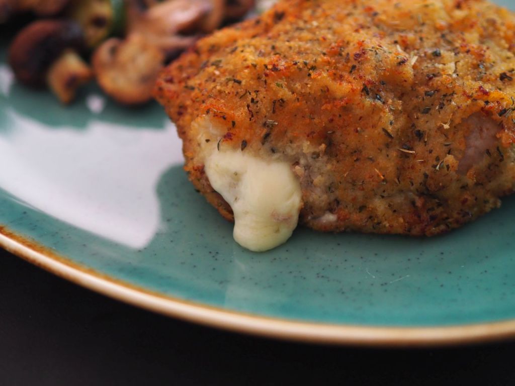Cordon Bleu mit geräuchertem Schinken und Fontina-Käse füllen, zu den Semmelbröseln Thymian, Oregano, Basilikum, panieren, eine Stunde im Kühlschrank ziehen lassen, um die Panier zu versiegeln, in Butterschmalz herausbacken.