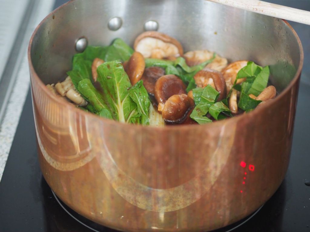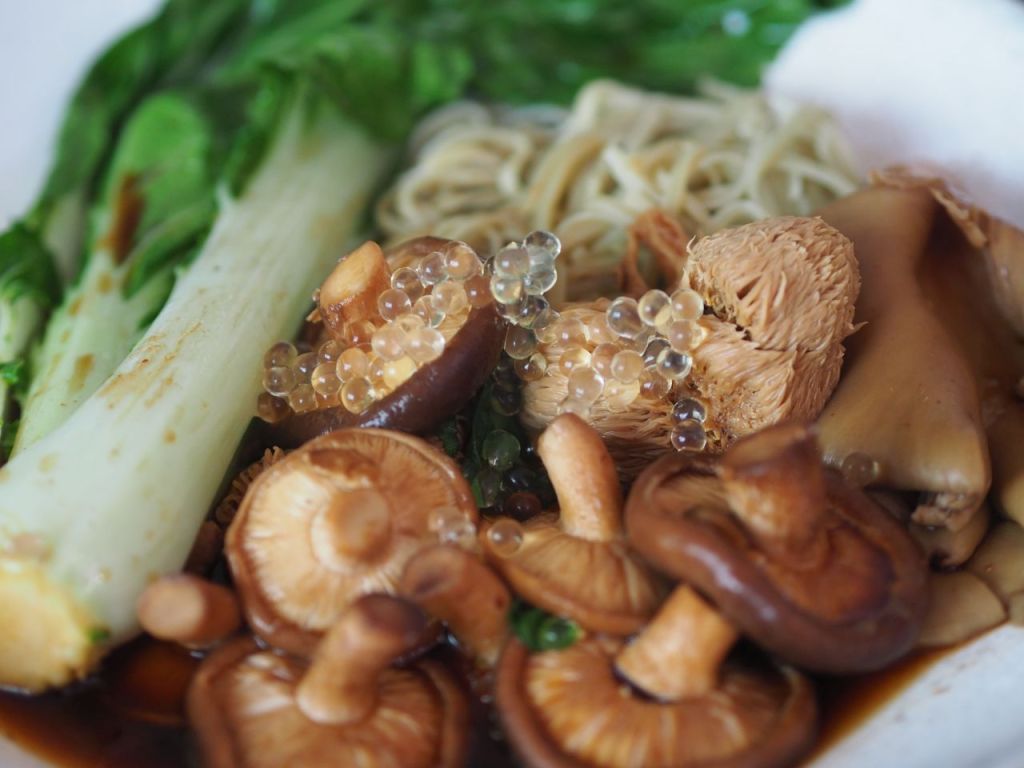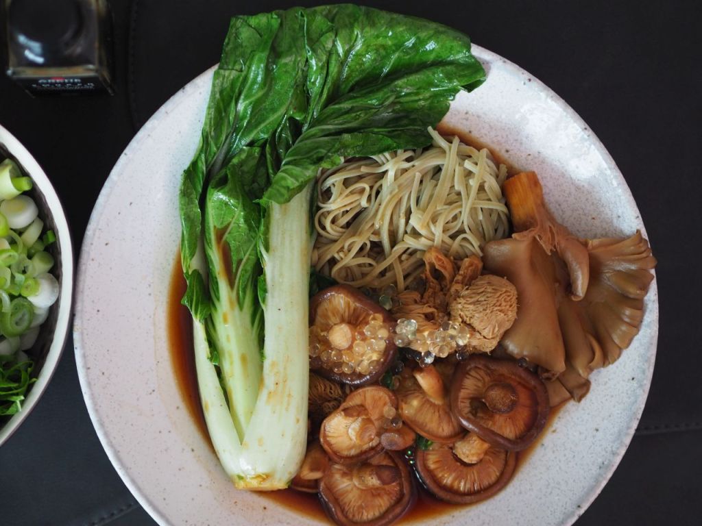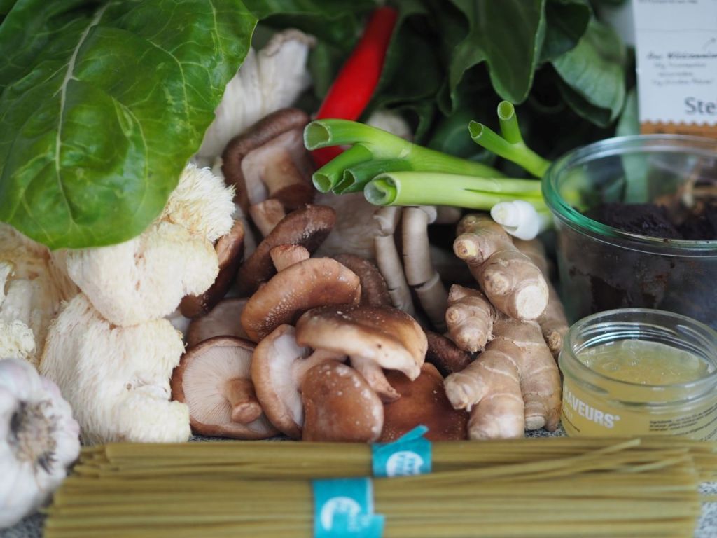 Eine Suppe mit Pilzen und Nudeln, Pak Choi und ein paar roten Chili im Salat. Ganz ohne Fleisch, dafür mit fleischigen Pilzen wie dem korallenartigen Pompon Blanc.