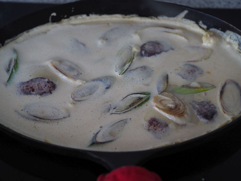 Achso, Im Originalrezept steht gar nicht Schafwurst, sondern Andouille, eine Spezialität aus Frankreich,. Da dachten wir, wir nehmen auch etwas Regionales, aber von hier.