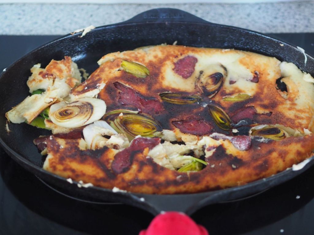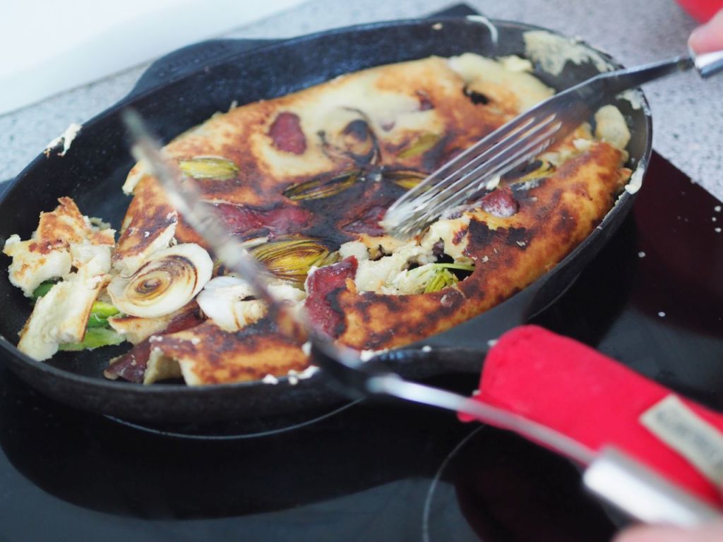 75 g Buchweizenmehl (Hadnmehl) mit 40 g Weizenmehl vermischen, 2 Eier trennen. Den Dotter und 350 ml Milch zum Mehl geben und zusammenrühren. Zum Schluss 40 g leicht gesalzene, geschmolzene Butter und das steif geschlagene Eiklar dazu geben. Abgedeckt eine Stunde im Kühlschrank ruhen lassen. In der Zwischenzeit den Porree schräg in 4 mm dicke Scheiben schneiden und die Schafwurst in dünne Scheiben schneiden. In einer Pfanne mit wenig Olivenöl den Porree und die Schafwurst beidseitig kurz anbraten und dann herausnehmen. Den Teig aus dem Kühlschrank mit den angebratenen Porreescheiben und Schafwurstscheiben in eine Pfanne geben und mit einem Schöpflöffel den Teig darüber gießen. Braten, den Teig dann wenden und wie eine Palatschinke herausbacken.