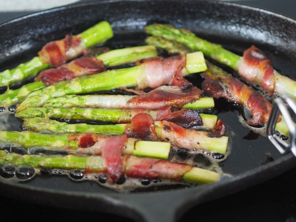 Der Spargel wird mit Frühstücksspeck eingewickelt und mit einer Tonkabohne aromatisiert. Die Tonkabohne lässt nämlich den Spargel in bestem Geschmacksbild erscheinen, sie ist zu verwenden wie eine Muskatnuss.