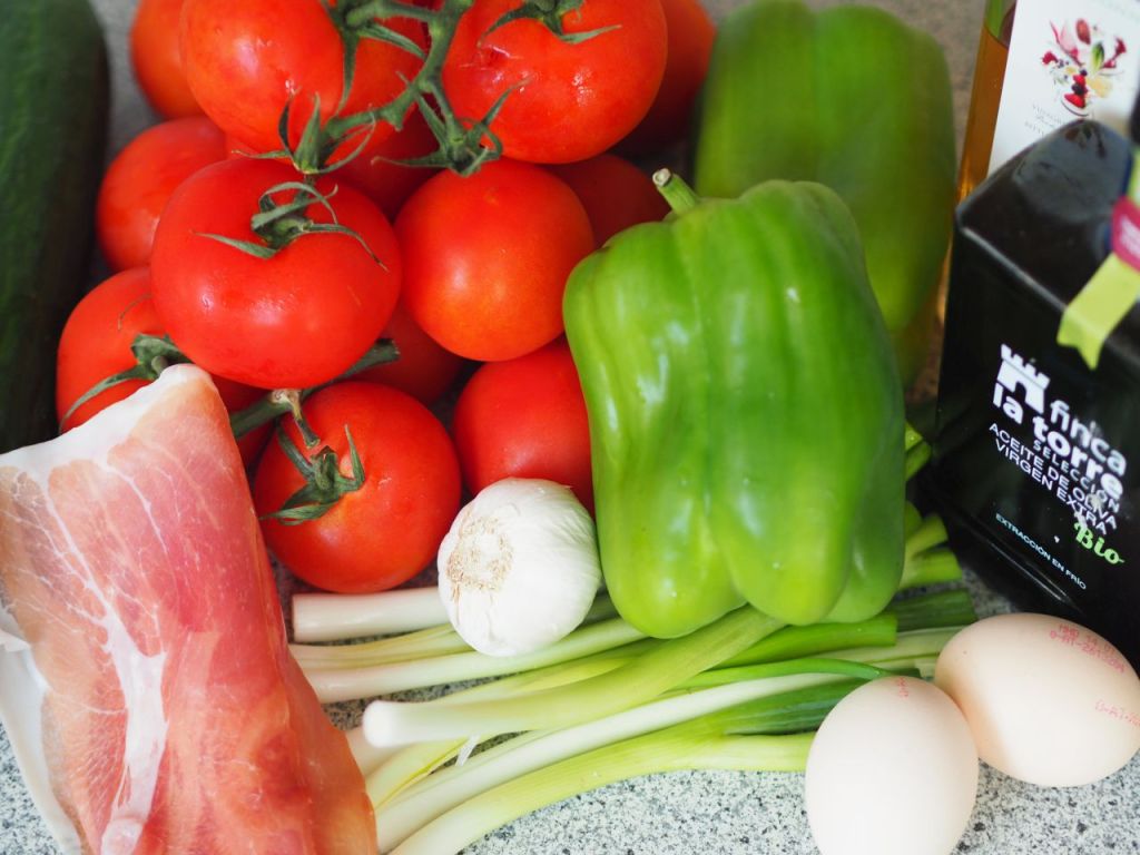 2 kg Tomaten blanchieren und enthäuten. Von einem grünen Paprika das Gehäuse entfernen und schälen. Eine kleinere Salatgurke schälen. Drei Knoblauchzehen abziehen. Alles mit 50 ml Chardonnay-Essig, 200 ml Olivenöl, zirka einen Viertelliter Wasser und Salz in den Mixer geben und pürieren, durch ein Sieb streichen. Suppe über Nacht in den Kühlschrank stellen.