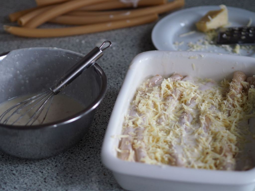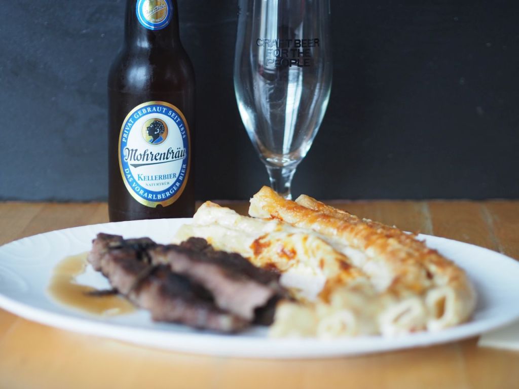 Candelas in Ziegen-Béchamelsauce: 3 fein gehackte Schalotten in ca. 60 g Ziegenbutter anschwitzen. Mit einem halben Liter Ziegenmilch aufgießen. Salz, Pfeffer und Muskatnuss dazu geben, einmal aufkochen und mit Maisstärke binden. 50 g Ziegenfrischkäse und 250 ml Schlagobers einrühren, noch mal mit Salz und Muskatnuss abschmecken. In der Zwischenzeit die Candelas in Rinderbrühe bissfest kochen und abgießen und abtrocknen. Die Nudeln in eine Ofenform legen und mit der Béchamelsauce begießen, bis es abgedeckt ist und mit geriebenem Vorarlberger Bergkäse bestreuen. Im Backrohr überbacken bis es leicht goldbraun ist.