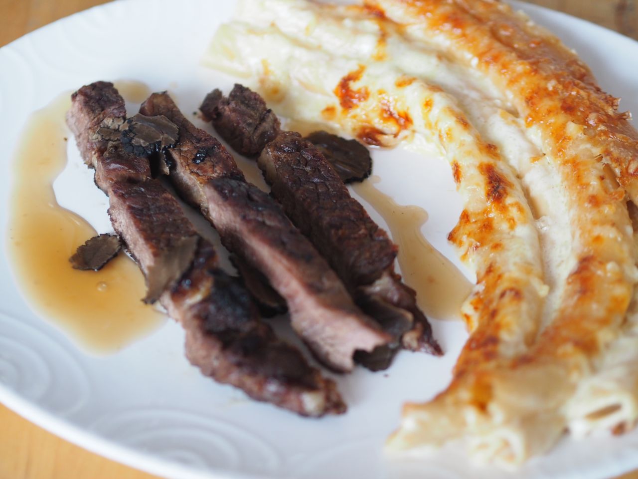 Alain Ducasse wäre nicht glücklich, wenn er wüsste, wohin uns sein Rezept geführt hat. Wir haben seine Neustrukturierung der Lasagne verwendet, nämlich Fleisch, Nudeln und Béchamelsauce und noch einmal überarbeitet. Lasagne wird gemacht aus Faschiertem, Lasagneblättern und Béchamelsauce. Ducasse verwendet als Fleisch das schönere, wertvollere Rinderkotelett vom Chalosse-Rind, als Nudeln Makkaroni. Und für die Béchamelsauce: die klassische Béchamelsauce. Wir haben für das Fleisch ein Côte de Boeuf genommen, bei den Nudeln haben wir noch eins draufgelegt: richtig große Nudeln, die Candele von Faella. Und bei der Béchamelsauce begnügten wir uns nicht mit der klassischen Variante: nein statt Butter Ziegenbutter, statt Kuhmilch Ziegenmilch und zum Binden verwendeten wir Maisstärke.