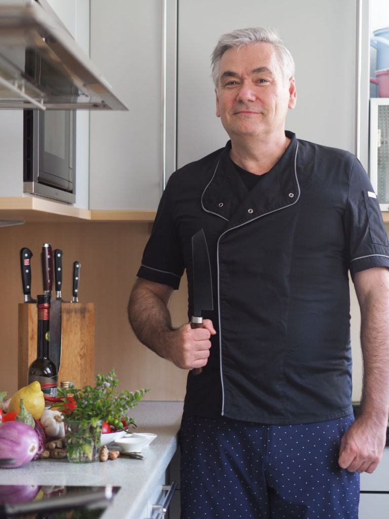 Übrigens, falls jemand fragt, warum die Kochjacke so eng ist: das muss so sein. Ansonsten könnte man irgendwo hängen bleiben an Haken, Henkeln oder wer weiß an was und Messer sind scharf.