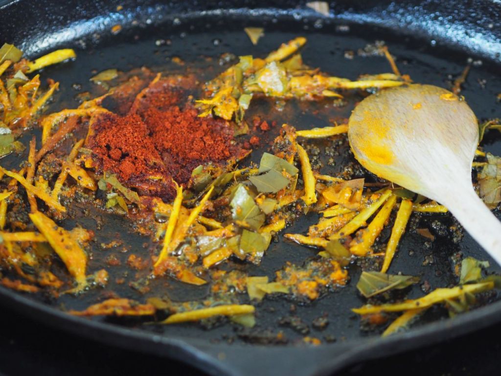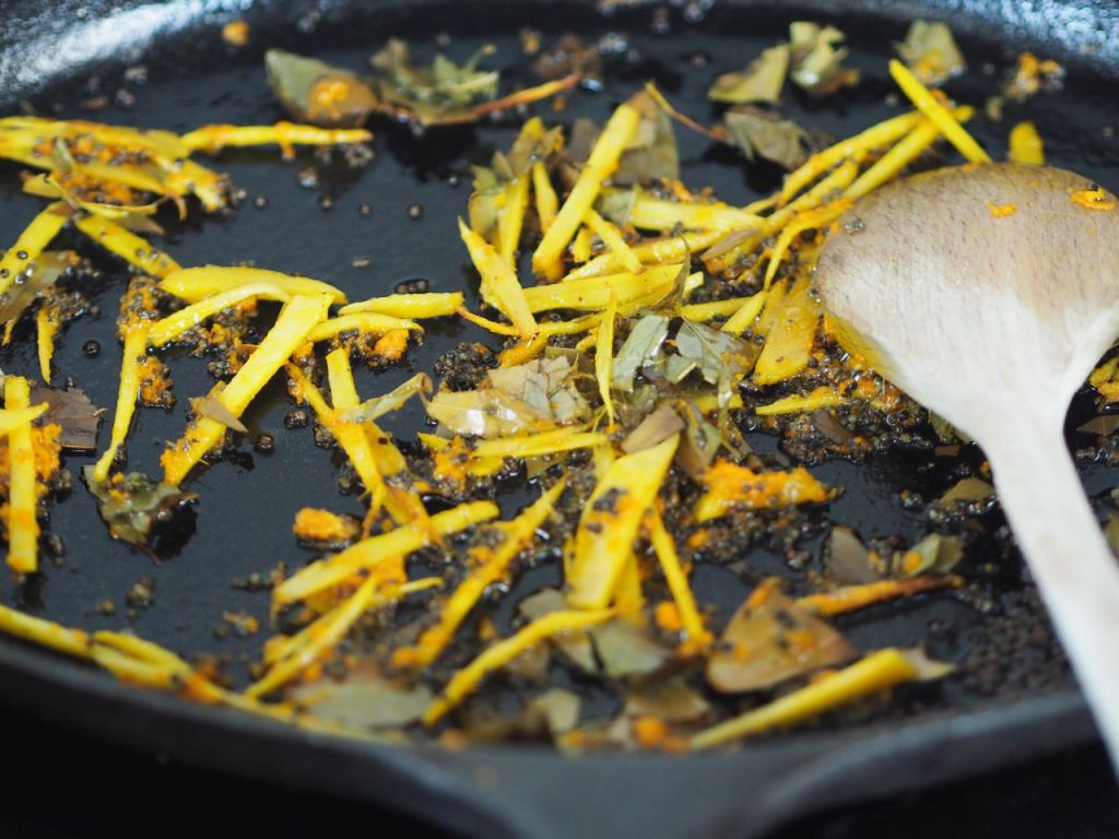 Fangen wir an: Gewaschene Kartoffeln mit Schale würfeln und in einer Pfanne mit reichlich Olivenöl anbraten, bis die Ränder dunkelbraun, die Kartoffelstücke wunderbar sind. In der Zwischenzeit einen kringeligen Faden Olivenöl in einer anderen Pfanne erwärmen. Zwei EL Senfkörner hinein geben. Achtung: die Kugerln sind ein guter Wärmeanzeiger, sie springen wieder heraus, wenn die Pfanne zu heiß ist. In diesem Fall zurückdrehen. Wir hatten schwarze Senfkörner, jegliche Art von Senfkörnern ist geeignet, vielleicht sind auch nur die schwarzen besonders springfreudig. Die schwarzen Senfkörner schmecken pur schon sehr gut. Von den Lorbeerblättern den Stängelansatz kappen und über der Pfanne zerbröseln. Unsere Lorbeerblätter kamen aus Indien, diese sind etwas größer und wir nahmen reichlich davon! Dann alles gut umrühren, damit es eine schöne Melange ergibt. Knoblauch in Scheiben schneiden und eine Ingwerknolle grob mit dem Küchenmesser von der Schale befreien, in feine Stifte schnippeln, dazu geben. Die erste Geruchsbombe wird gezündet. Und die zweite folgt sogleich: das Kurkumapulver einstreuen und wieder umrühren.