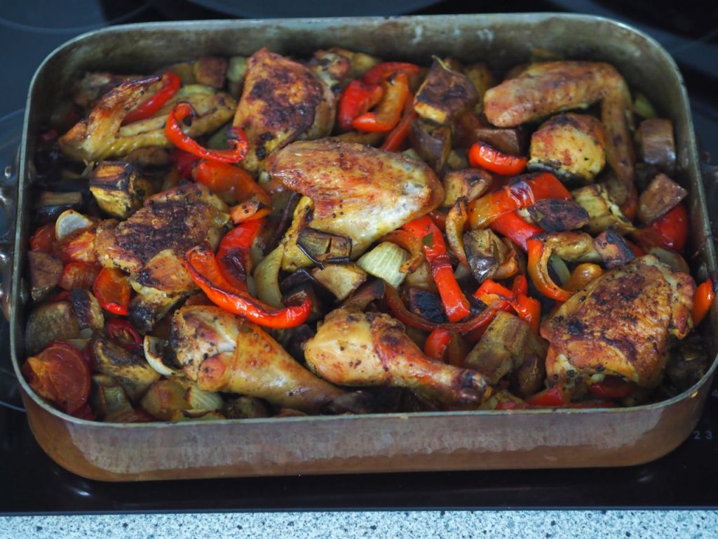 In der Zwischenzeit drei kleine Auberginen, zwei rote Paprika und drei Zwiebeln grob und zwei Chilischoten (je nach Länge und Schärfe gut dosieren) fein schneiden und in die Pfanne geben. Gut umrühren. Abwarten bis das Gemüse angebraten ist, immer wieder umrühren und die Zeit nützen, um die Hühnerschenkel zu halbieren. Diese dazu geben. Wir mussten das in zwei Schritten erledigen, die Pfanne war zu klein. Die Bratreine wäre groß genug und wenn man gleich alles in der Bratreine anbratet, ergibt das eine Pfanne weniger hernach abzuwaschen. Sodann alles gut vermischen, hineingreifen und gut durchmischen, und wenn die Hühnerstücke einen geschmacklich guten Eindruck hinterlassen, alles in die Bratreine umladen, das sieht bergig aus, und in das Backrohr bei 180 Grad schieben. Für etwa 45 Minuten.