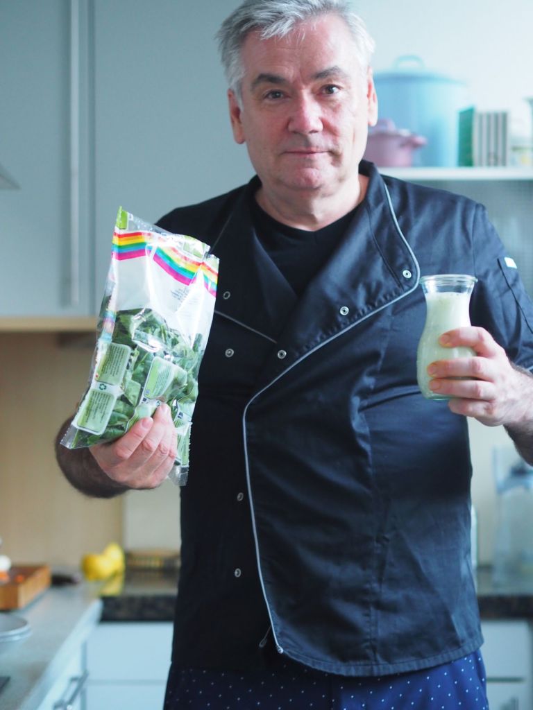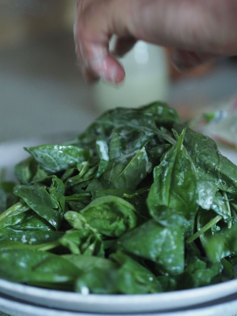 Dazu gibt es Spinatblätter mit Joghurtsauce. Ein Drittel der Joghurtsauce in den Beutel mit den Spinatblättern geben, gut zuhalten und schütteln. Den Rest der Joghurtsauce in Schälchen servieren.