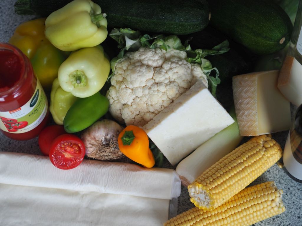 Doch alles der Reihe nach: Wir haben in einer Pfanne mit Olivenöl gehackte Knoblauchzehen Farbe nehmen lassen. Dann ein paar grob gehackte Basilikumblätter dazu geben. Geschälte Tomaten aus dem Glas mit dem Saft dazu geben. Salz, Pfeffer, gehackten Rosmarin dazugeben und leise köcheln. Das Gemüse – Lauch, Zucchini, Paprika, Mais, Karfiol – schneiden und in der Pfanne hintereinander rösten und dann zur Tomatensauce geben. Eine Viertelstunde köcheln lassen und mit Salz, Rosmarin, Thymian abschmecken. Bis es köchelt, den Blätterteig in einer Bratform mit Backpapier auslegen und dann den Blätterteig reinlegen, so damit die Ränder herausstehen und den Teig mit dem Messer am Boden dem Rand entlang einschneiden. Bei 180 Grad den Blätterteig vorbacken, bis er hellbraun ist. Dann herausnehmen und auskühlen lassen. Den vom Boden abgehobenen Blätterteig wieder zurückdrücken. Das Tomatengemüse darauf legen. Und mit Manchego, Pecorino, Bergkäse, alle vom Schaf, belegen. Weitere 10 Minuten in das Backrohr schieben, damit der Käse schmilzt. Der Käse kann zum Teil stückig bleiben, das ergibt einen wunderbaren Kontrast zum geschmolzenen Teil des Käses.