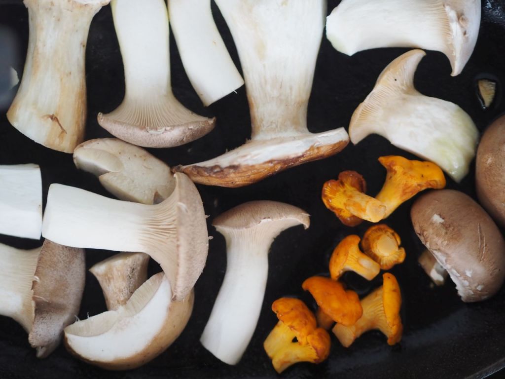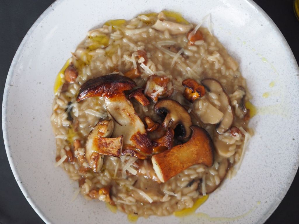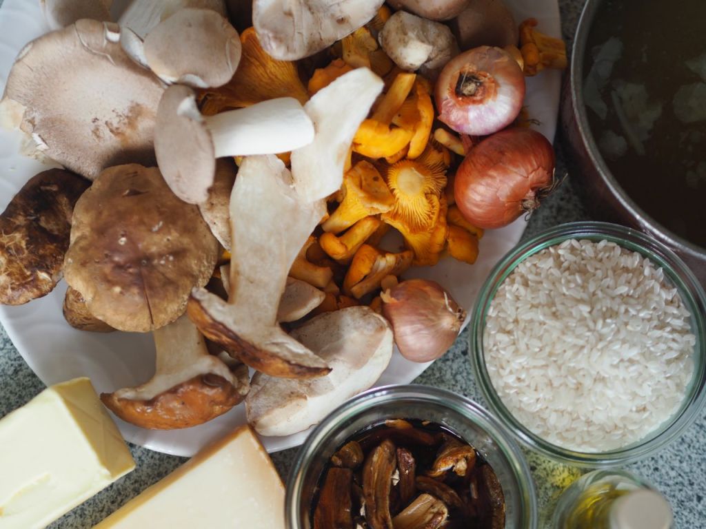 Ein paar getrocknete Steinpilze eine Stunde lang in lauwarmes Wasser legen. Dann 2 EL Olivenöl und einen EL Butter leicht in einem Topf erhitzen, 3 fein gehackte Schalotten anschwitzen. 200 g Champignons in feine Scheiben schneiden, 2 Champignons auf die Seite legen, 300 g Eierschwammerl putzen, einige davon auf die Seite geben, 3 kleine Kräuterseitlinge in Scheiben schneiden, zwei auf die Seite legen. 2 schöne Steinpilzstücke auf die Seite stellen, 5 Steinpilze putzen und stückeln. Die geschnittenen Pilze zu den Schalotten in die Pfanne geben. Ein paar Minuten mitgaren. 300 g Risotto-Reis einrühren und bei mittlerer Hitze so lange anschwitzen, bis der Reis perlweiß wird. Die getrockneten, mittlerweile eingeweichten Steinpilze samt dem Sud dazugießen. Die getrockneten Steinpilze geben erst den richtige intensiven Geschmack Zweieinhalb Liter Hühnerbrühe erhitzen. Ein bis zwei Schöpflöffel von der Hühnerbrühe in den Topf mit dem Reis geben, rühren. Wenn die Hühnerbrühe vom Reis mehr oder weniger aufgesogen ist, einen oder zwei weitere Schöpflöffel Hühnerbrühe dazu geben. Rühren, immer wieder rühren, 20 Minuten rühren, bis der Reis schön schlotzig ist. Den Topf mit dem Reis vom Herd nehmen und etwa 80 g Butter und 60 g frisch geriebenen Parmesan einrühren. Während dem Rühren vom Risotto die auf die Seite gestellten Pilzstücke halbieren und in der Grillpfanne auf beiden Seiten braten.