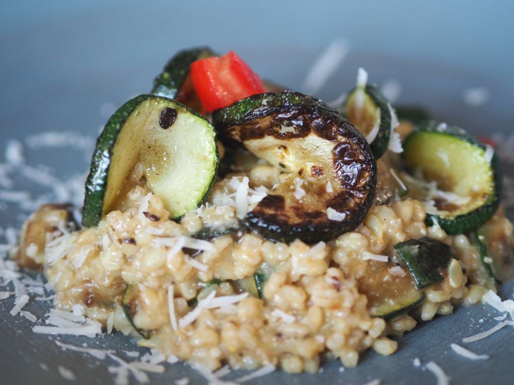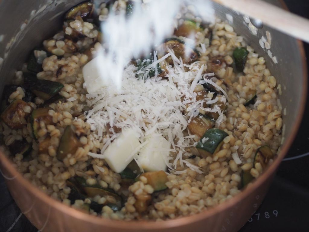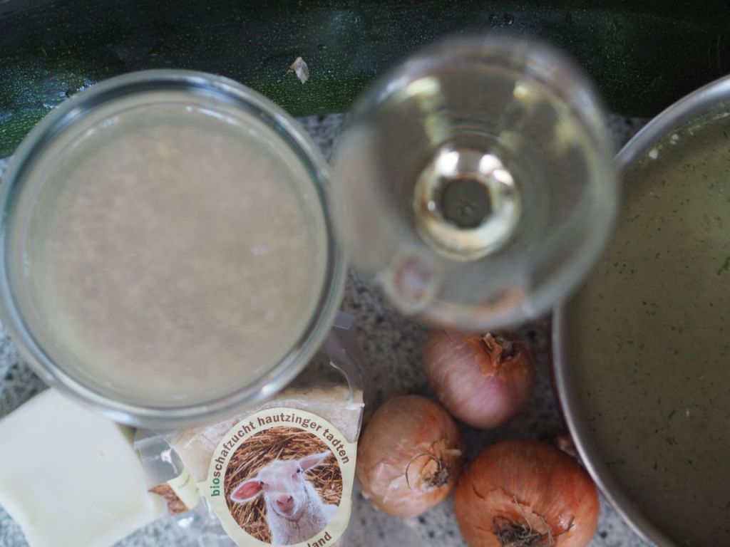 160 g Rollgerste in kaltem Wasser ein paar Stunden einweichen, dann abtropfen lassen. Drei fein gehackte Schalotten in 50 g Ziegenbutter anschwitzen. Das Rollgerstl dazu geben, ein paar Minuten mitschwitzen lassen Mit einem Achterl Grünen Veltliner „Muschelkalk“ ablöschen. Nachdem der Weißwein eingeköchelt ist, einen Schöpflöffel Gemüsesuppe – wie beim Risotto – dazu geben und ständig rühren. Zucchini würfeln und in einer Bratpfanne mit wenig Olivenöl anbraten. Insgesamt an die 30 Minuten köcheln lassen und etwa 1,4 L Gemüsesuppe dazu geben. Die Zucchiniwürfel einrühren und weitere 2 bi 3 Minuten köcheln lassen. Die Zucchini dürfen nicht von Anfang an mit dabei sein, da sie sonst nicht mehr bissfest wären. Vom Herd ziehen. 30 g Ziegenbutter und 40 g Schaferino einrühren.