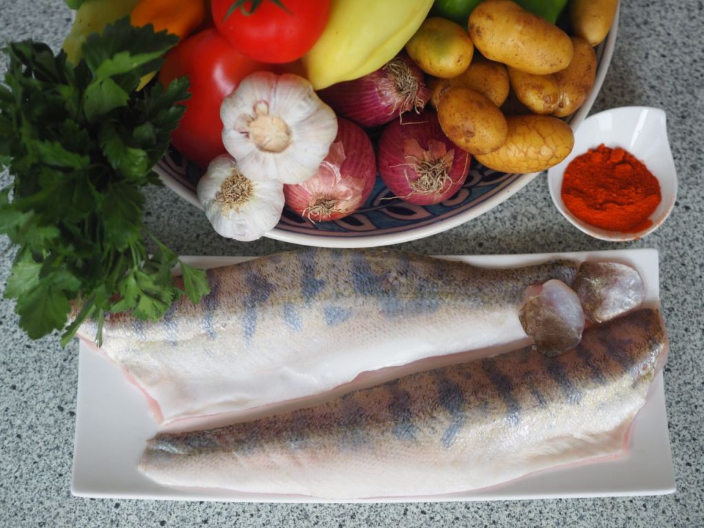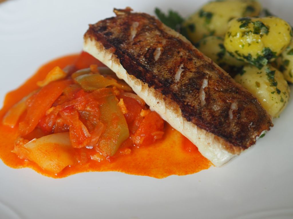 Wenn man den Zander, ungarisch Fogosch, nur mit etwas Öl in der Pfanne bratet, ohne Kräuter, kommt er am besten zur Geltung, Zander hat einen eigenen, unverwechselbaren, außergewöhnlich guten Geschmack, den man durch nichts überdecken will. Paprika und Tomaten werden so lange mit einander verköchelt, bis sie sich zu einer Melange verbinden, dem Letscho, so heiß wie die Sonne Ungarns, besonders wenn man einen scharfen Paprika erwischt wie wir. Und dabei ist es unverfälscht und pur, so schmeckts am besten.