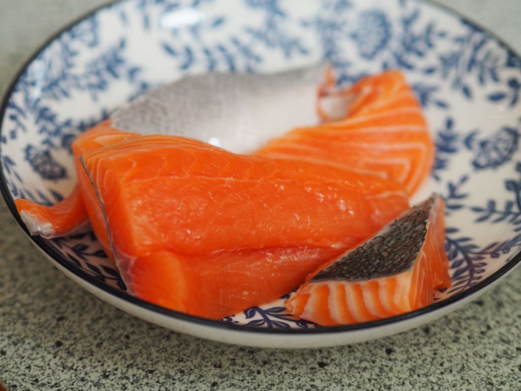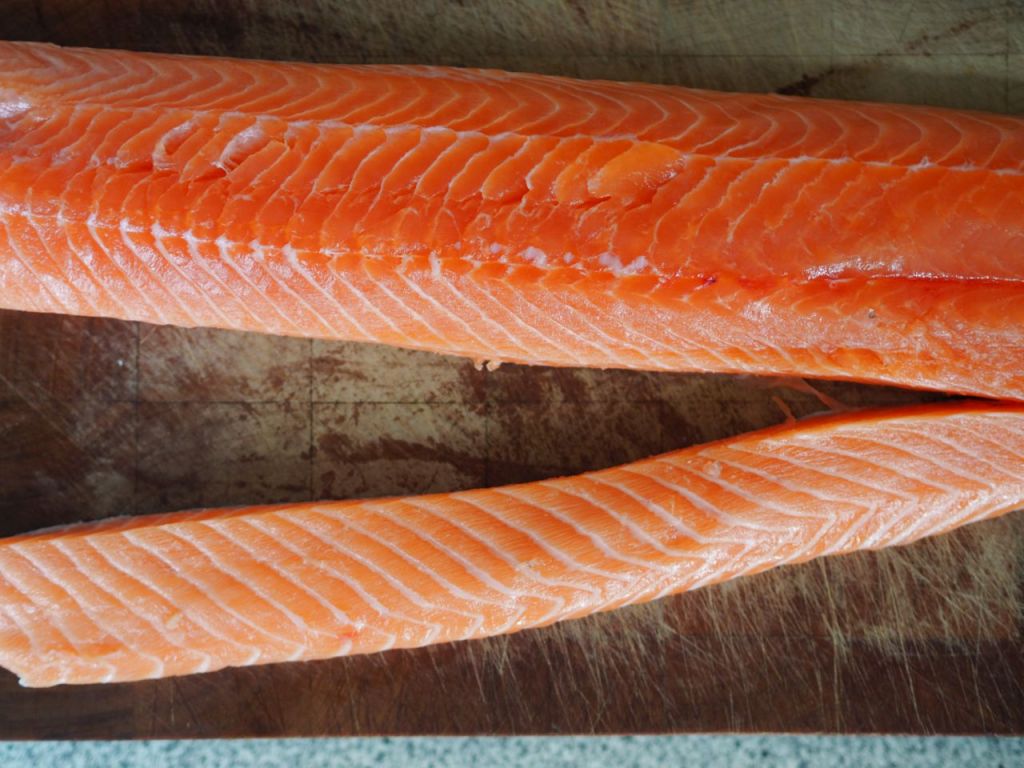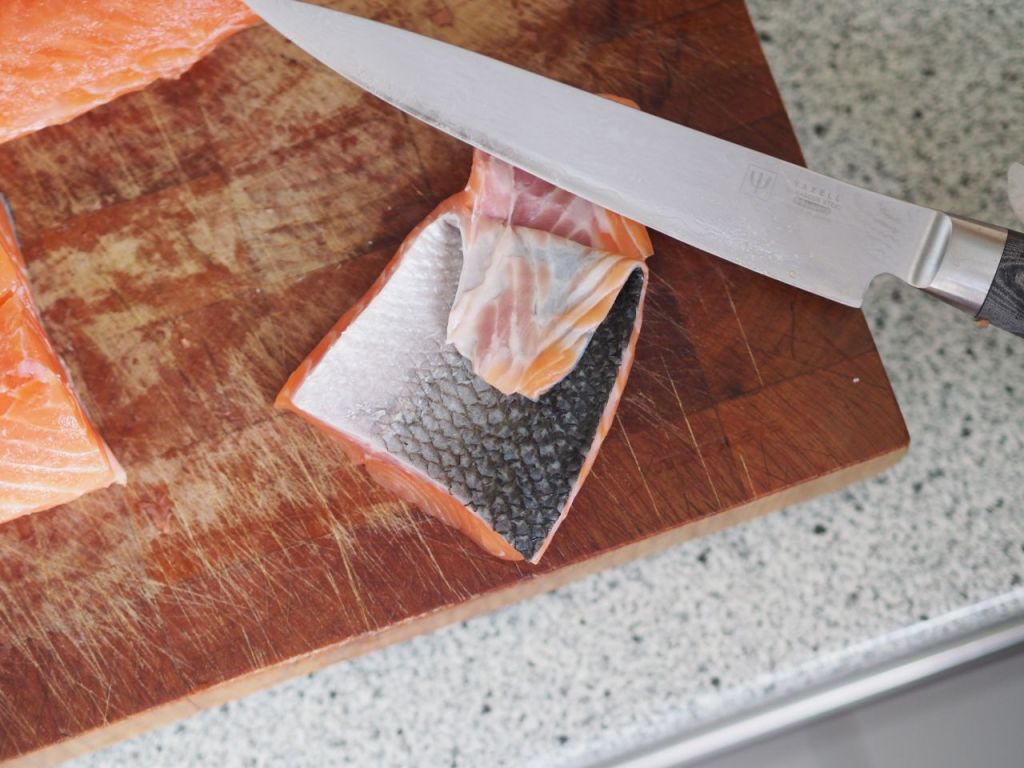 Vom Lachsfilet wird der „Block“ abgeschnitten, nur dieser wird für das Gericht verwendet. Der Bauchlappen und das Schwanzstück kommen weg, daraus machen wir Frikadellen. Aber das ist eine andere Geschichte.