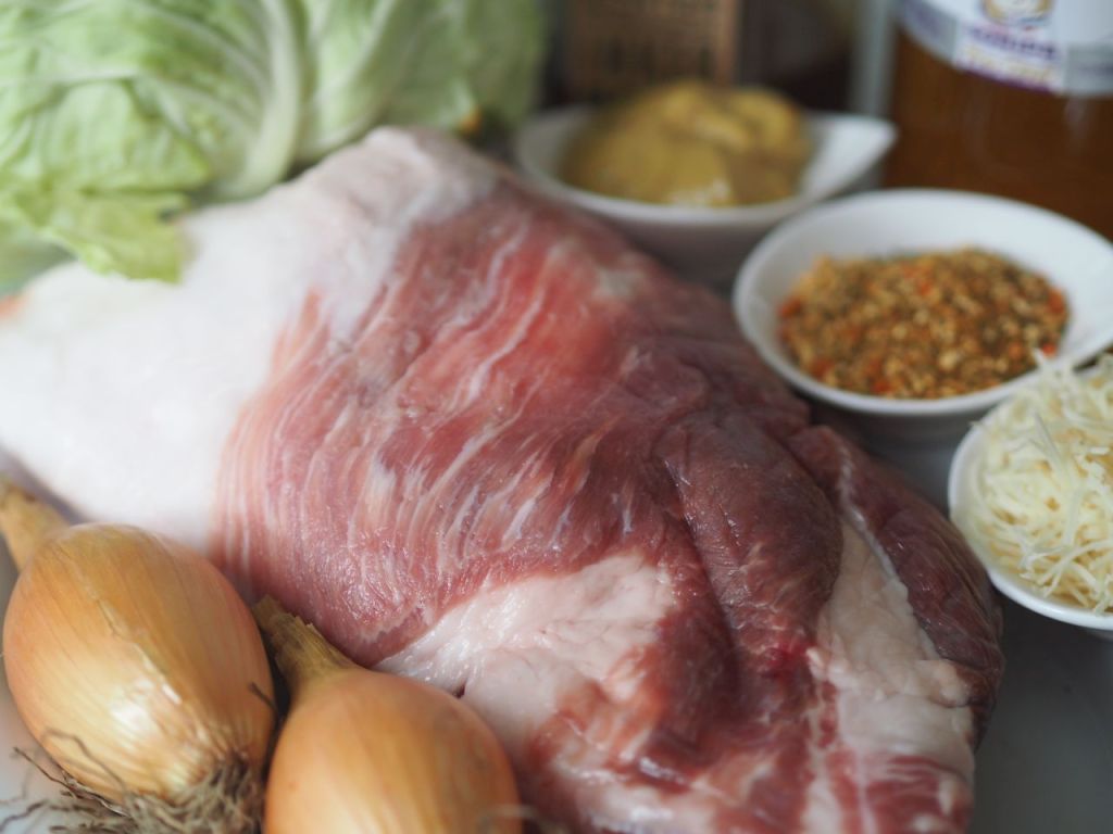 Dazu haben wir eine ungarische Gewürzmischung bekommen: getrocknetes, grob gemörsertes Pulver aus Pastinaken, roten Zwiebeln, Karotten, Knoblauch, Thymian, gemahlenen Paprika, Majoran Senfkörner, Rosmarin, Koriander, Kümmel, Ingwer und schwarzem Pfeffer. Kein Salz und keine Konservierungsmittel und keine Geschmacksverstärker sind darin enthalten, nur Gewürze! Von „Novaland“ aus Szeged, Ungarn: Füszerkeverék (Gewürzmischung) „Sertés“ (Schwein). Damit wird es nun vollkommen authentisch ungarisch!