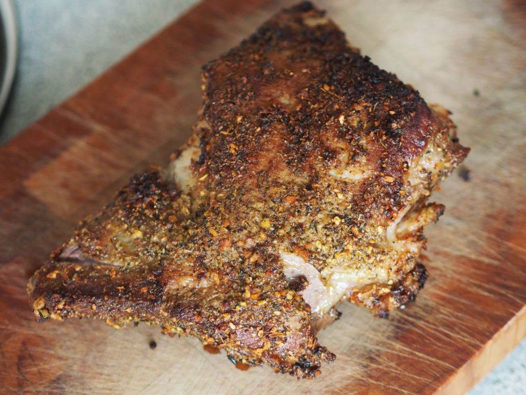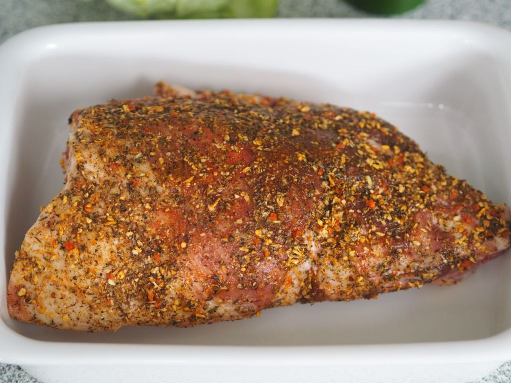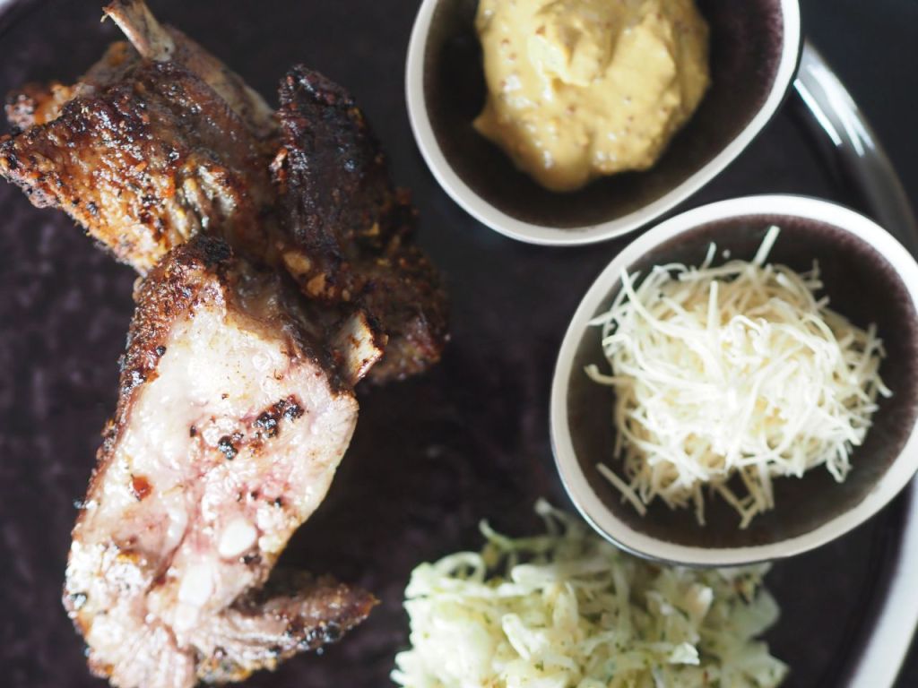 Mangalitza-Rippen In der halben Stunde, in der der Krautsalat zieht, das Mangalitza mit der ungarischen Schweine-Gewürzmischung aus Szeged einreiben. In einer feuerfesten Form im Backrohr für zirka 40 Minuten braten lassen, auf 180 Grad drehen.