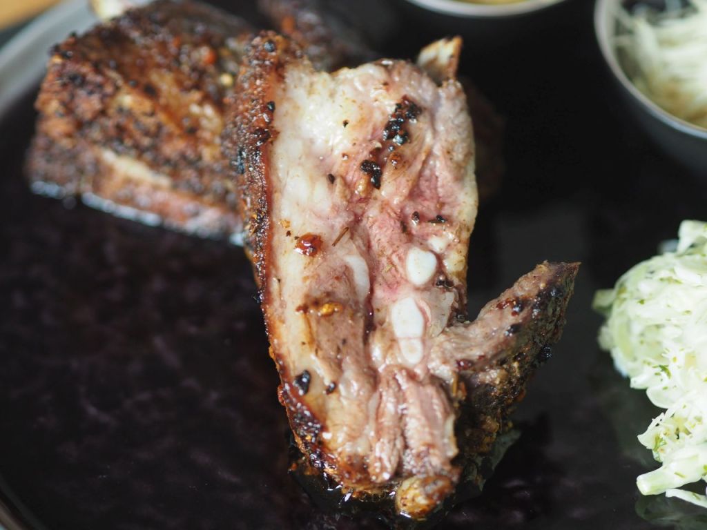 Das Stück war sehr fleischig mit einem sehr hohen Fettanteil für ein Rippenstück, das muss wohl an der Schweinerasse liegen, Mangalitza-Schweine sind bekannt für ihren extrem hohen Fettanteil, deshalb ist es so geschmackig. Dieses Fleisch muss sich daher besonders gut zum Grillen eignen, Fleisch das nicht austrocknet. Davon hätten wir gerne mehr gehabt. Bedauerlicherweise haben wir uns nicht ein größeres Stück bestellt. Wir haben das Rippenstück bis zum Ende abgenagt, bis zum Knorpelgewebe, ungarisch porcogo (porcszövet).